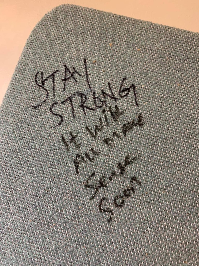 In the bathroom there was always a bulletin board decorated with some educational information that our managers assumed we all skipped over in our emails. Sometimes there would be sign up sheets for unit councils, infographics convincing us to take on more responsibilities at work, that sort of thing. For the past few weeks though the bulletin board looked different. To be totally honest I don’t remember the exact prompt but it was an interactive bulletin board which was out of the norm. It said something to the extent of “why is it important to you to provide exceptional care to your patients?”. There were sticky notes with sharpies and a decent amount of replies. Some generic, some satirical and some thoughtful and moving. After staring at the board during my five minute bathroom break, I grabbed a sharpie and pulled off a sticky note to add to what my coworkers has written. Just then, I noticed some writing not on the sticky note and not about the exceptional care prompt we were suppose to respond to. Written in sharpie on the bulletin board corner was, “stay strong it will all make sense soon”. I looked at the words, how they were placed where they didn’t belong, pondered on the permanence of those words on the fabric of the bulletin board in the staff bathroom and I began to cry. I wasn’t entirely sure why I was now sitting on the toilet in the staff bathroom crying looking at a simple phrase, but I was. I got myself together, rinsed off my now puffy red face, took a picture of those words and went about my day.